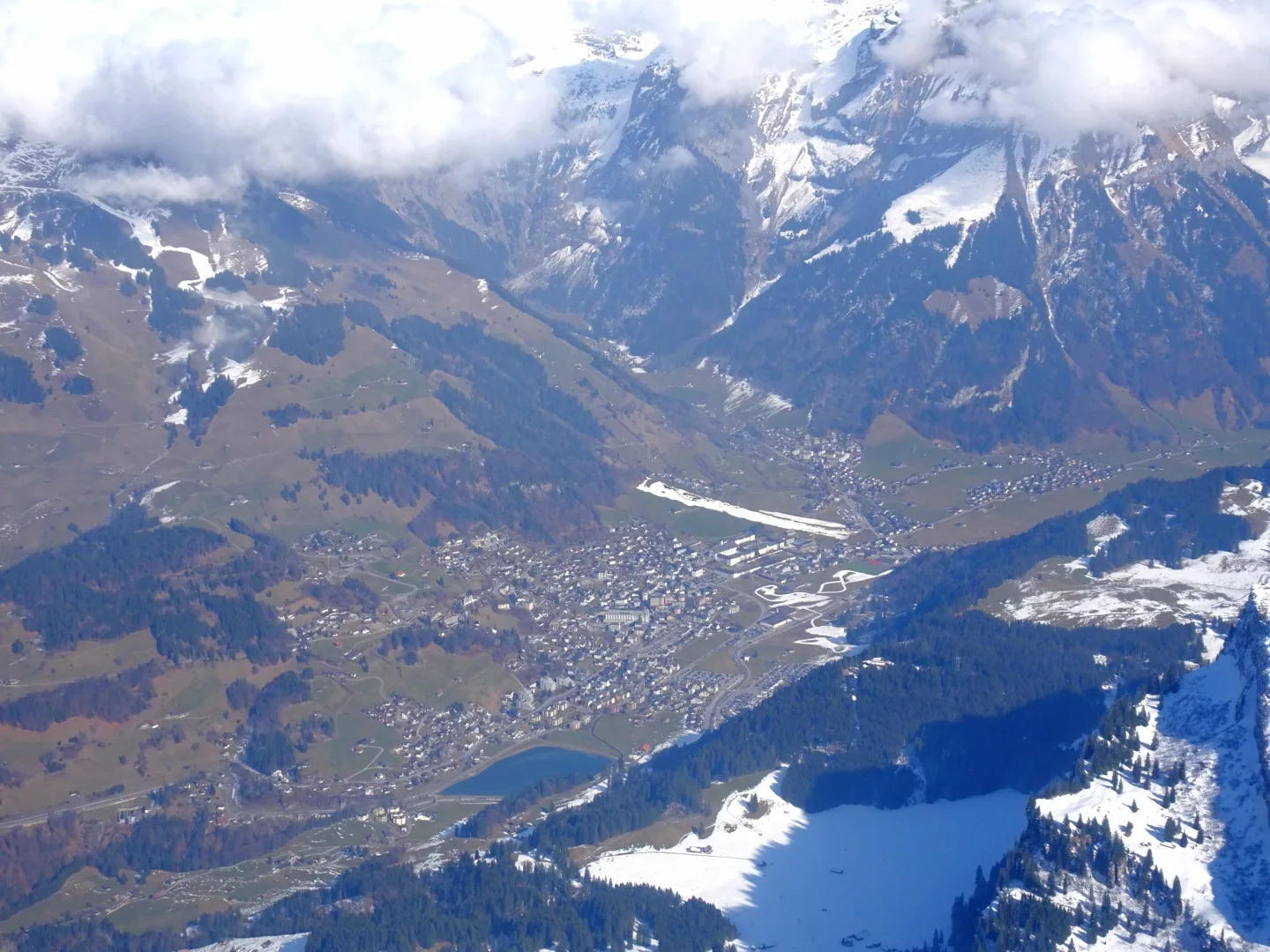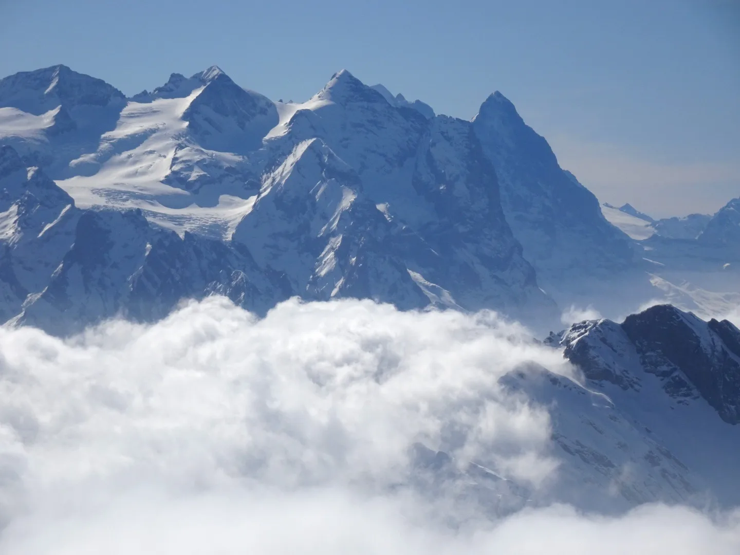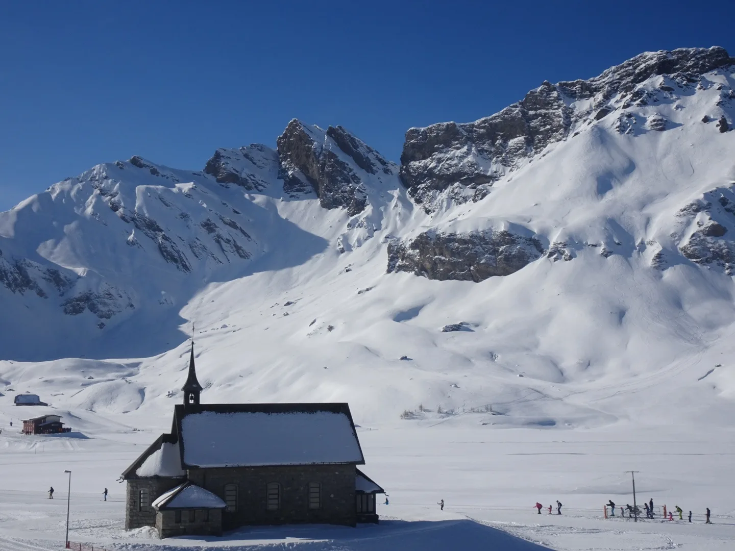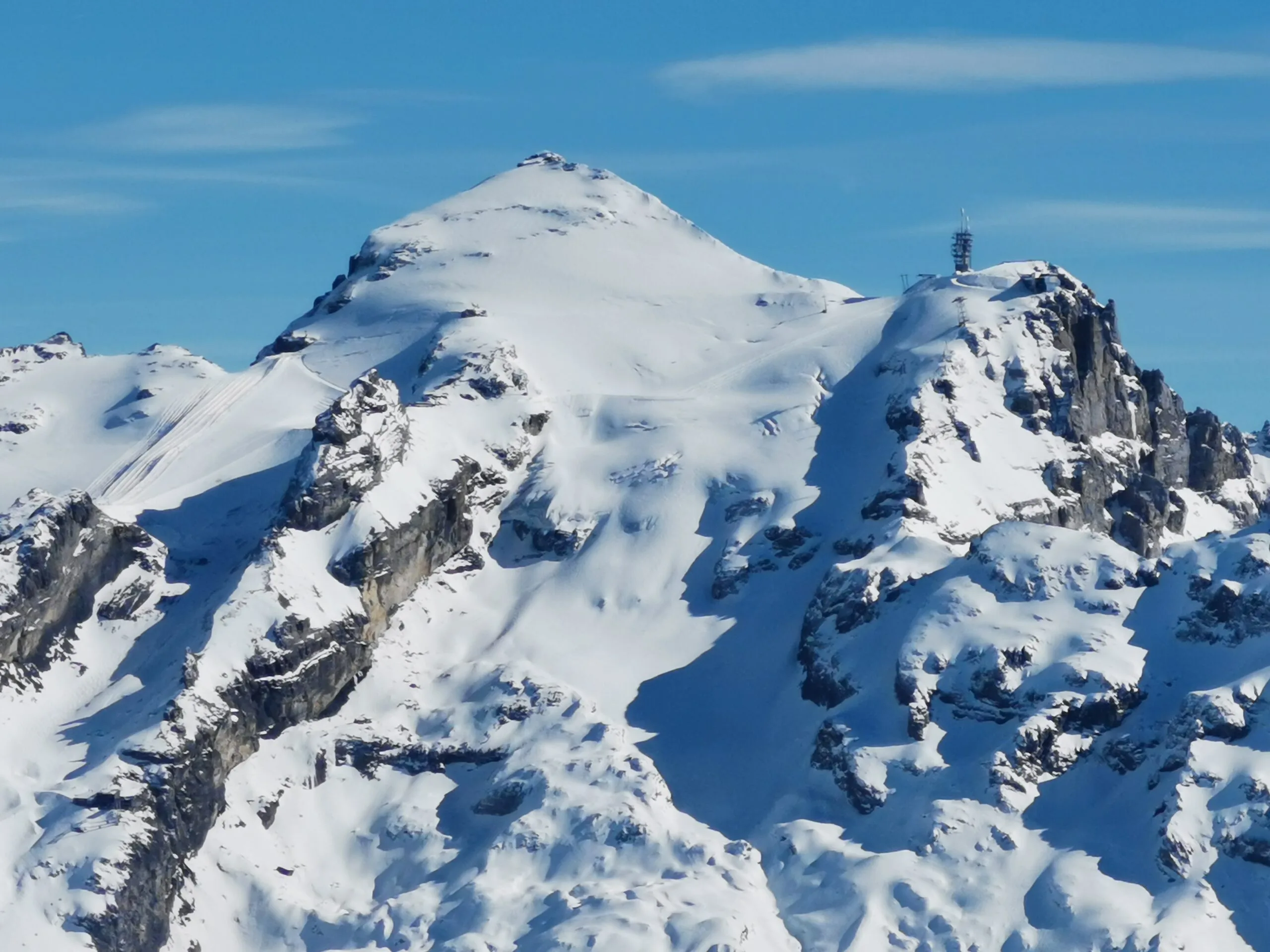 Eiger, Schreckhorn, Wetterhorn und Finsteraarhorn, Chasseral sowie Spannort, Titlis und tief unten das schneefreie Engelberg. Die Abfahrt vom Gipfel bis zur Frutt war imposant. Ab Frutt fuhren wir 6 dann auf der Piste bis zur Talstation Stöckalp.