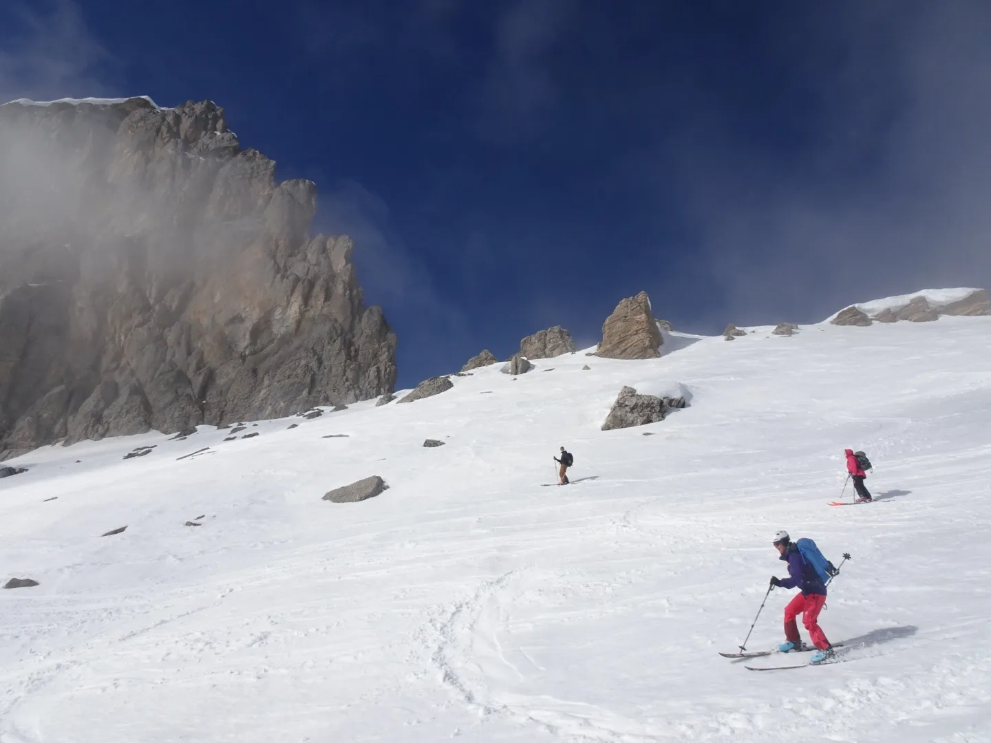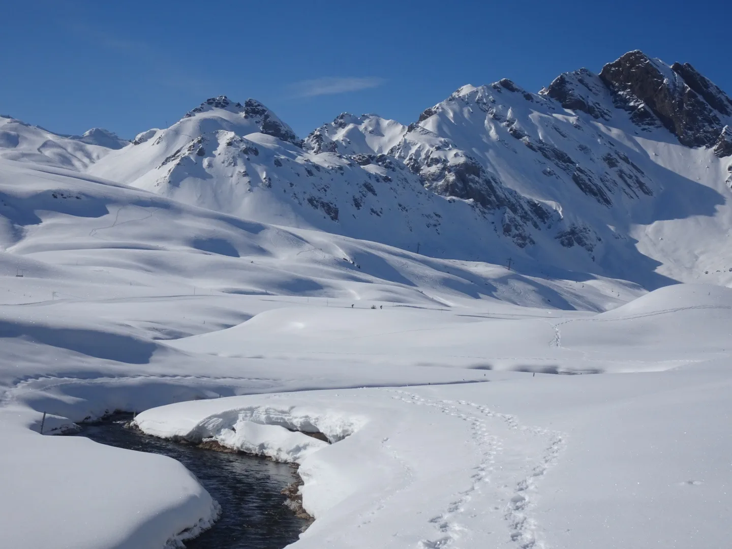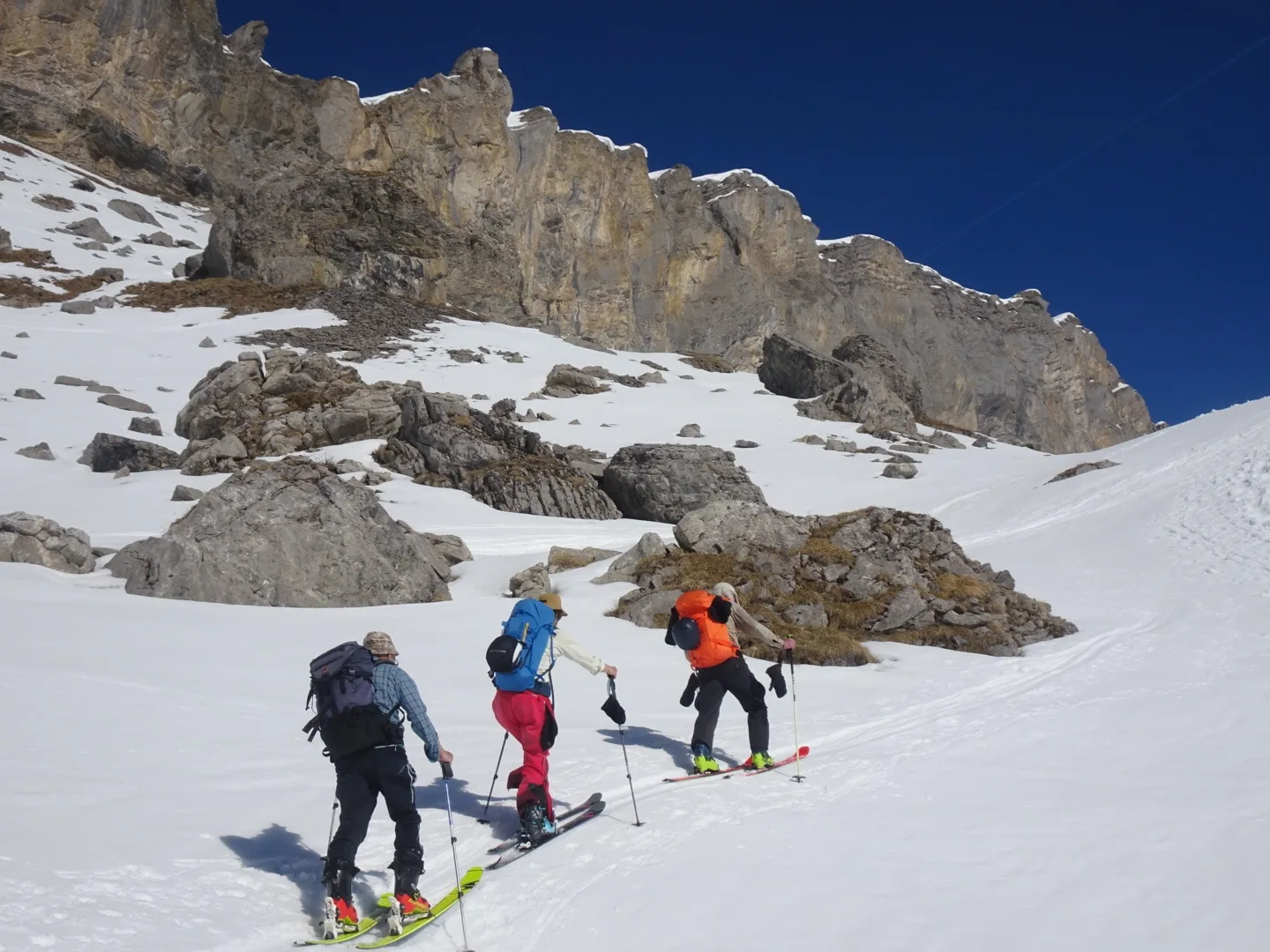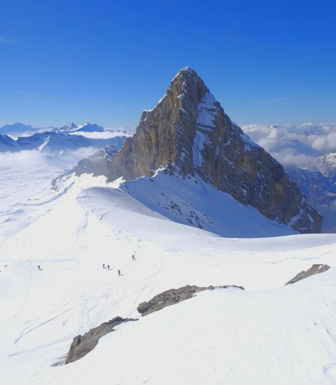 Eiger, Schreckhorn, Wetterhorn und Finsteraarhorn, Chasseral sowie Spannort, Titlis und tief unten das schneefreie Engelberg. Die Abfahrt vom Gipfel bis zur Frutt war imposant. Ab Frutt fuhren wir 6 dann auf der Piste bis zur Talstation Stöckalp.